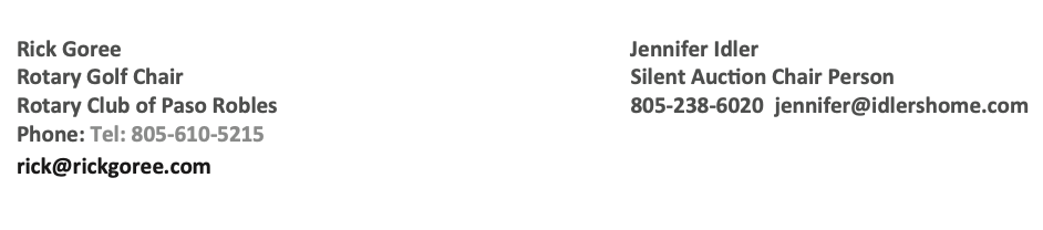 Our event is expected to draw over 120 players and participating businesses. Please call me to arrange for pick-up of any donated items. You can mail any certificates or passes to the Rotary Club of Paso Robles, C/O Rick Goree – 1947 Spring St., Paso Robles, California, 93446